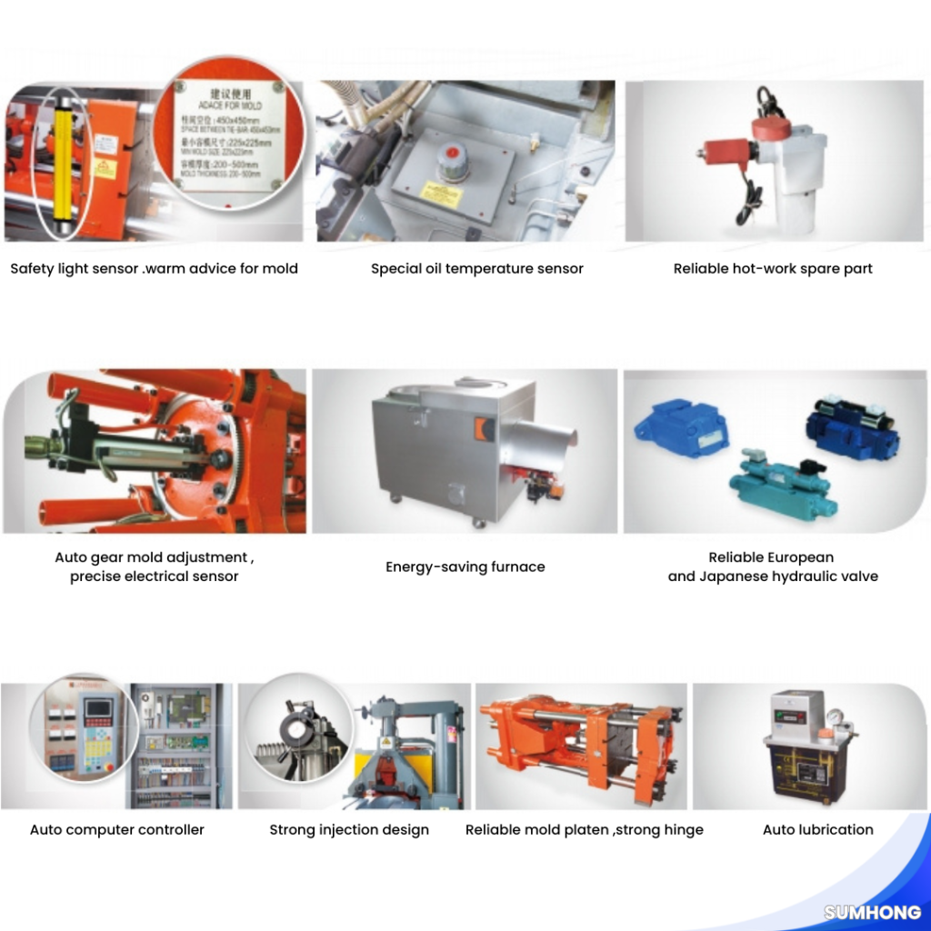 • Strong locking, injection, and ejection force ensure casting products are solid and dense.